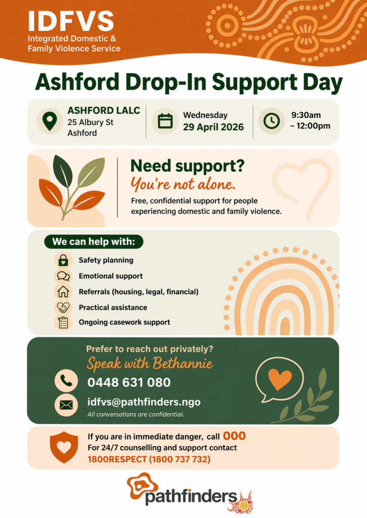 Pathfinders Integrated Domestic and Family Violence Service will be hosting an Ashford Drop-in Support Day at the Aboriginal Land Council, 25 Albury Street, Ashford.